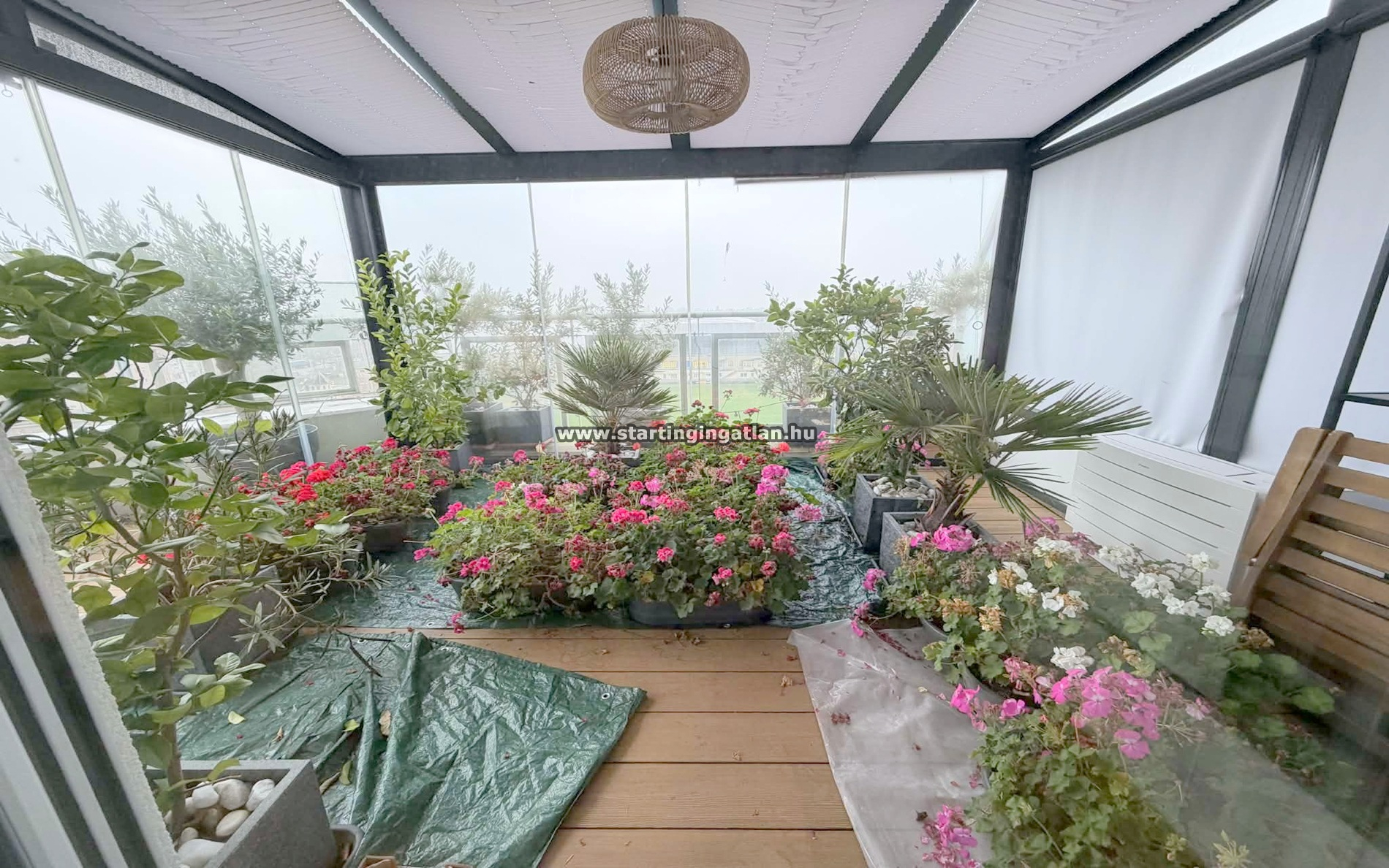 A 94 m²-es, teljesen bútorozott lakótérhez egy lenyűgöző, 130 m²-es tetőterasz kapcsolódik, ahol valódi zöld oázis várja az új lakókat: olajfák, citrusok, muskátlik, rózsák és gyümölcstermő növények között pihenhet, miközben a saját, négyszemélyes szaunaház, az üvegház és a kényelmes kerti kanapé a mindennapokat is különlegessé teszi.