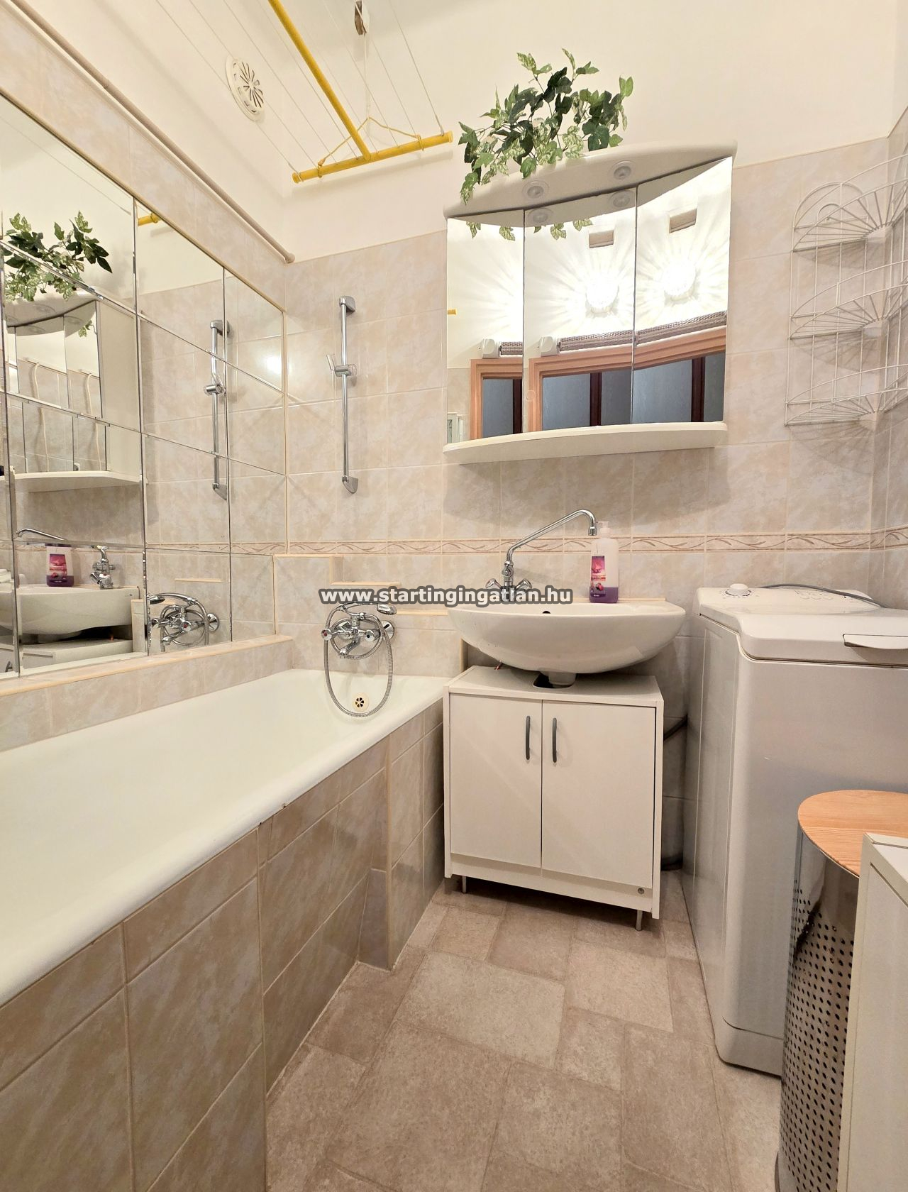 A lakás frissen felújított konyhával, fürdővel és WC-vel várja új bérlőjét. Modern háztartási gépekkel felszerelt – így többek között mosógép, mikró, külön fagyasztó, új sütő, gáz főzőlap és mosogatógép is rendelkezésre áll. Az egyik szobában klíma biztosítja a nyári hűtést, míg a fűtést gázradiátorok és egy elektromos radiátor látják el az étkezőben. Lift nincs az épületben.