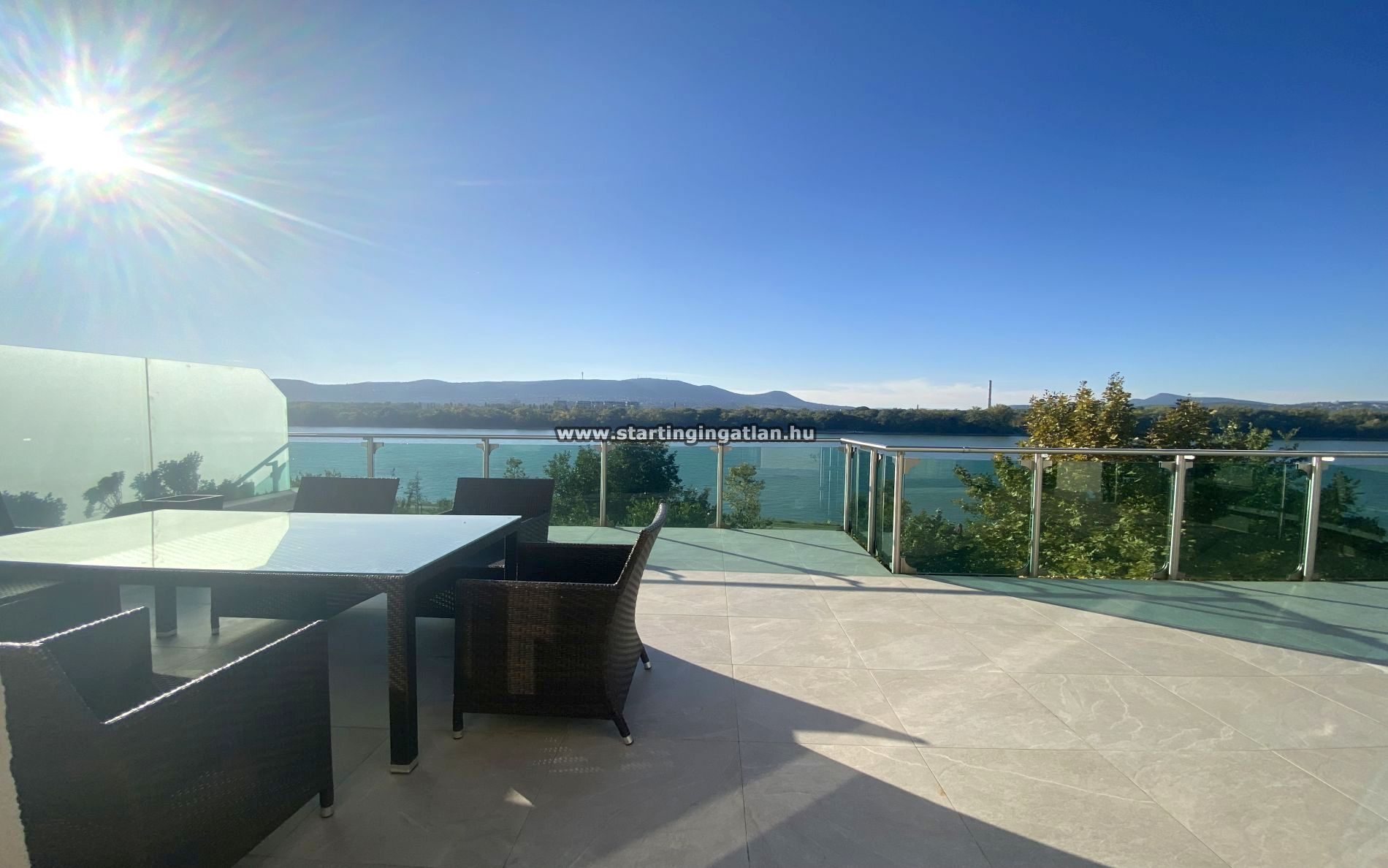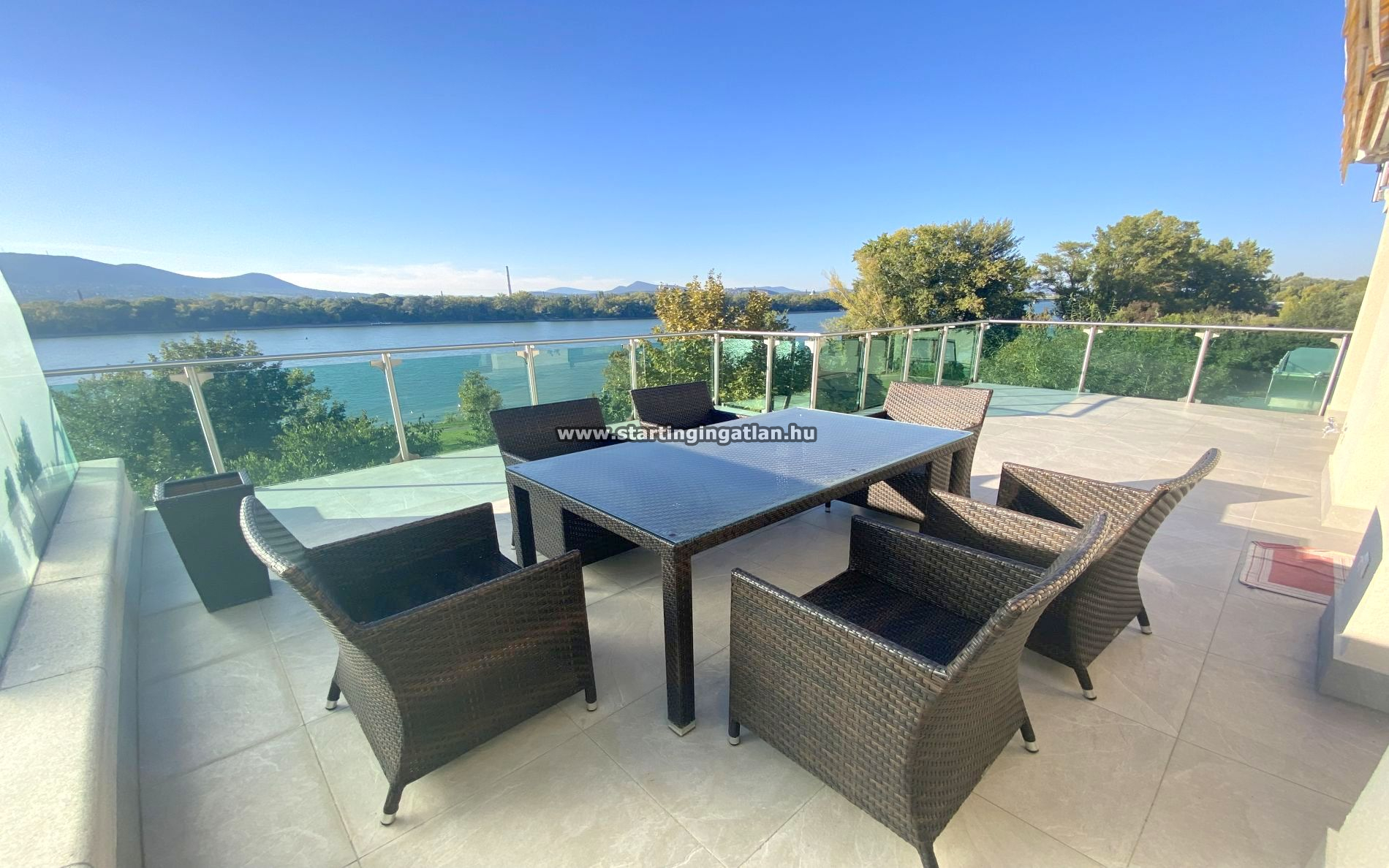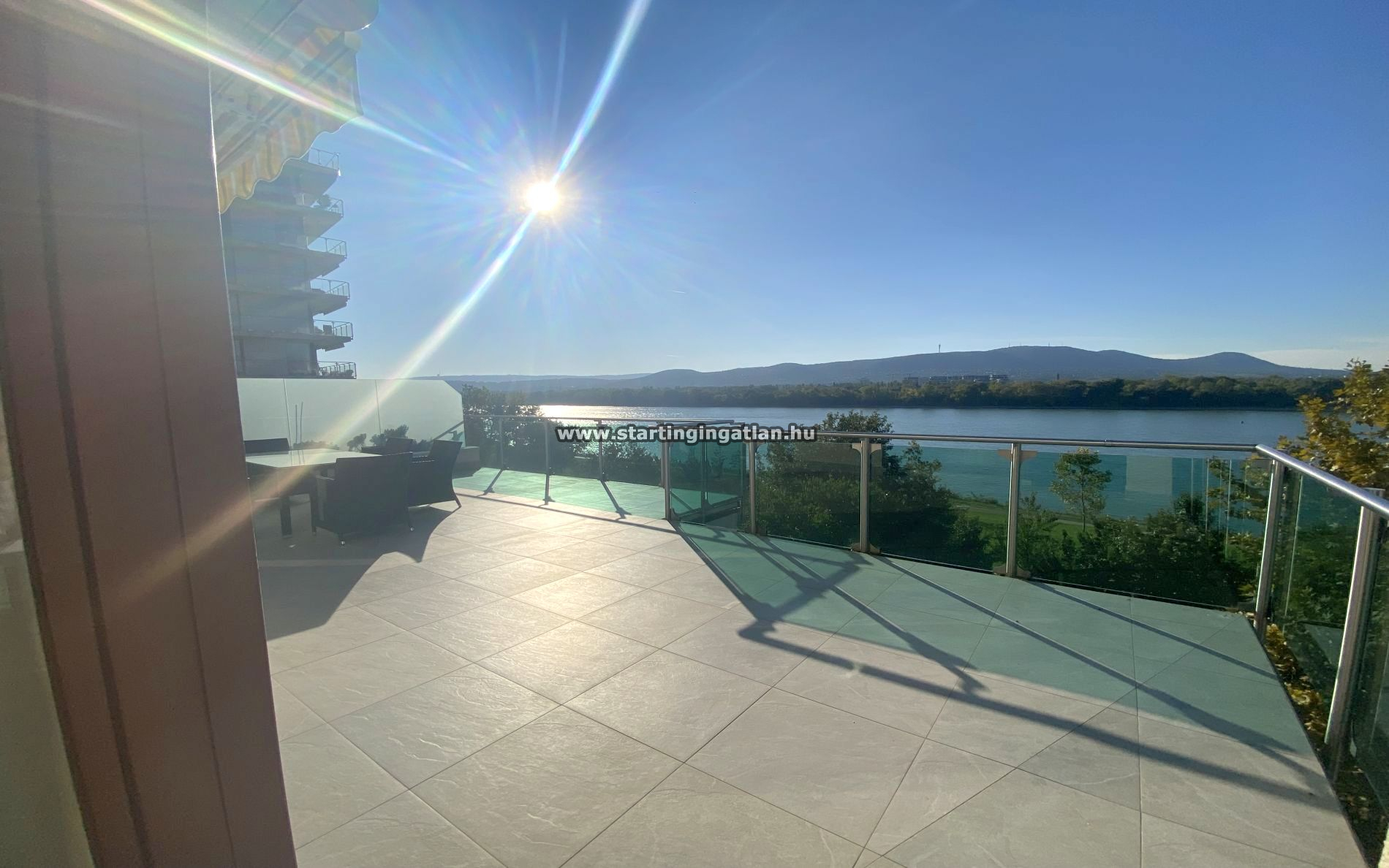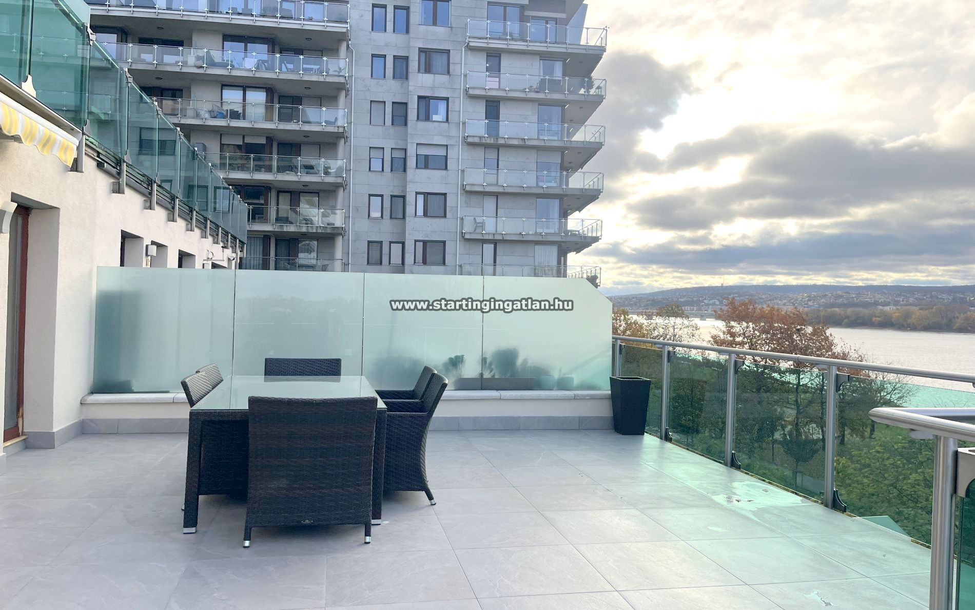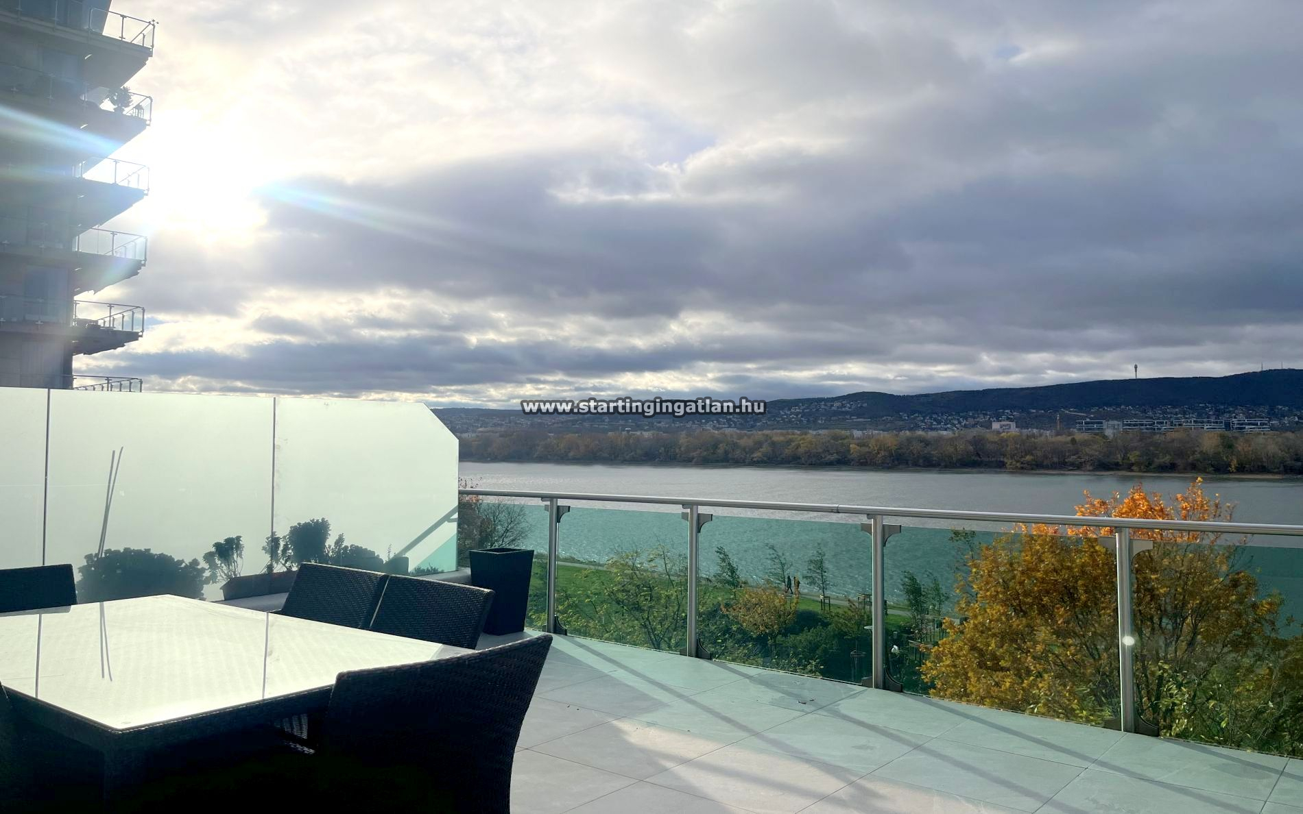 A lakás egyik legkiemelkedőbb része a 50 m²-es, nyugati fekvésű terasz, ahonnan lélegzetelállító, elvehetetlen panoráma nyílik a Dunára és a Hajógyári-szigetre. A motorosan állítható napellenző, az intelligens hangulatvilágítás és a kényelmes rattan étkezőgarnitúra tökéletes környezetet teremtenek a pihenéshez, naplementenézéshez vagy baráti összejövetelekhez. A lakás belső terei világosak és harmonikusak, minden részlet igényesen megtervezett, az egyedi LED-világítás és a minőségi bútorok modern, mégis otthonos hangulatot biztosítanak.